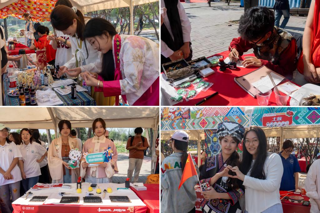 在民族传统文化展区,各学院师生多维度呈现、打造民族团结主题的文化大观园。通过场景化布置与互动体验,既展现了各民族厚重的历史底蕴,也融入了天理学子富有创意的时代色彩。